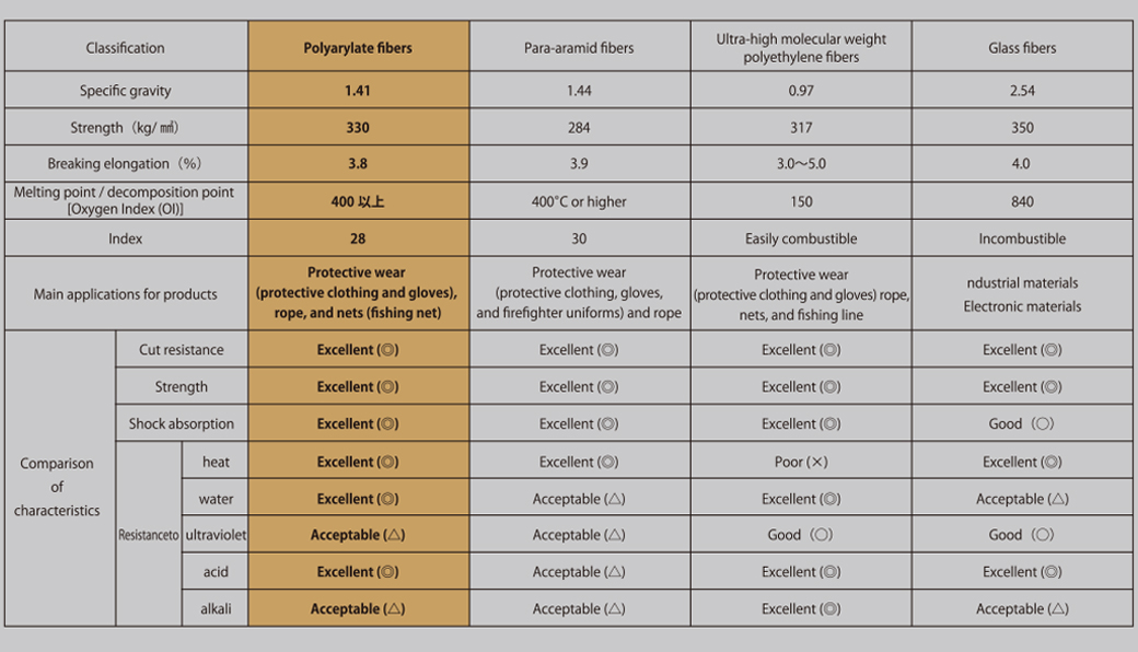 Comparative table of physical with other cut resistance fiber