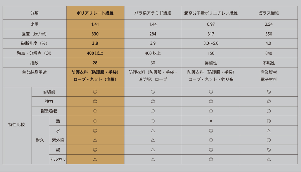 高強力の有機系繊維「ポリアリレート」と、